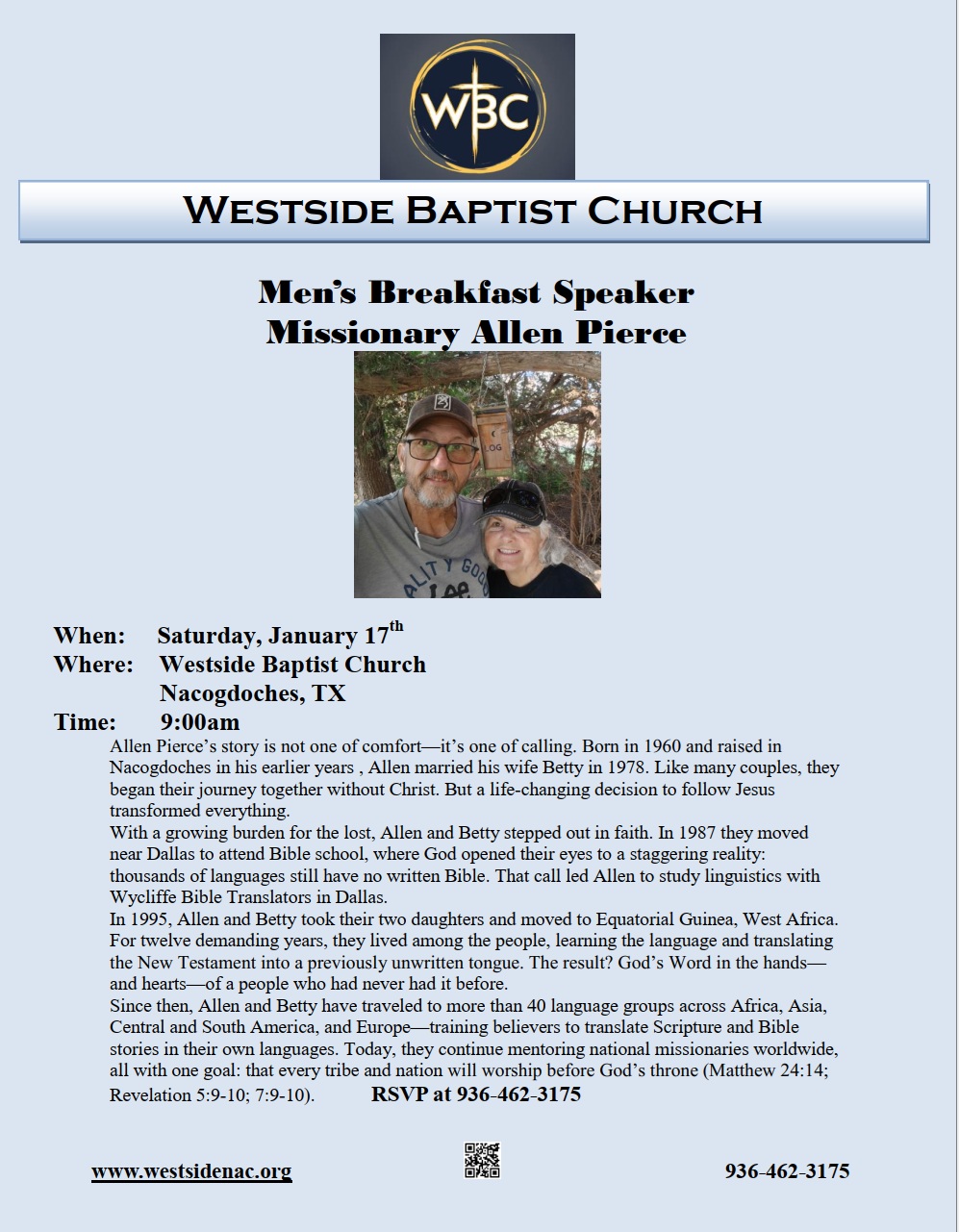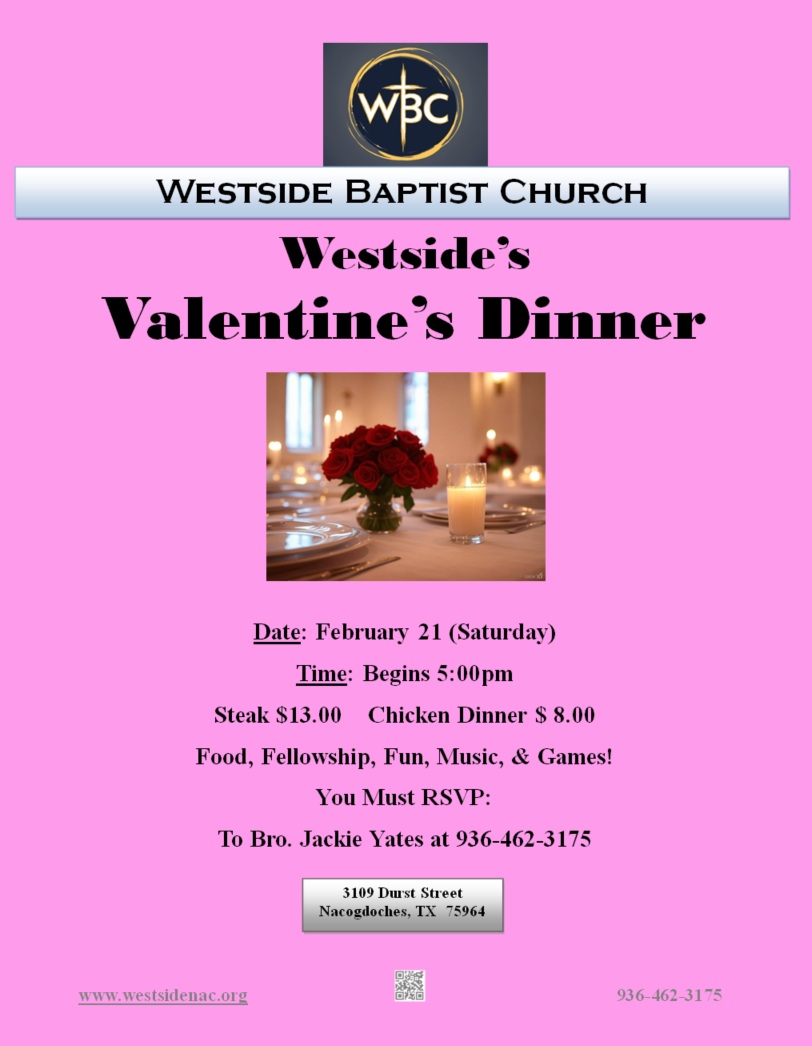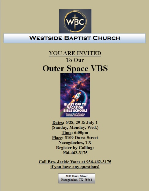 Welcome to Westside MBC Nacogdoches. We are looking forward to meeting you! Here you will find a warm and inviting atmosphere where you will be welcomed by smiling faces. Our Sunday School starts at 10am and our worship services start at 11am.
